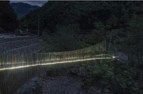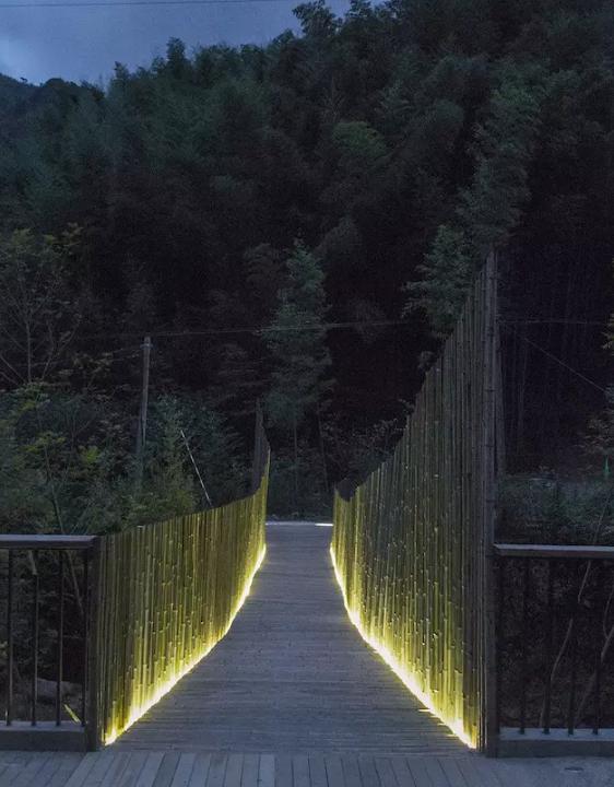 最終,在余姚中村小溪上架起的這座竹橋,僅花了 2.6 萬(wàn),其中 2.1 萬(wàn)人工費(fèi),5000 元材料費(fèi)。它造價(jià)低廉卻質(zhì)樸優(yōu)美,僅有 1.2 米的橋身剛好是足夠一人走、另一個(gè)人側(cè)身而過(guò)的尺度,到了晚上,小橋上安裝的燈帶散發(fā)著微光,為它增添了一分別樣的美感。